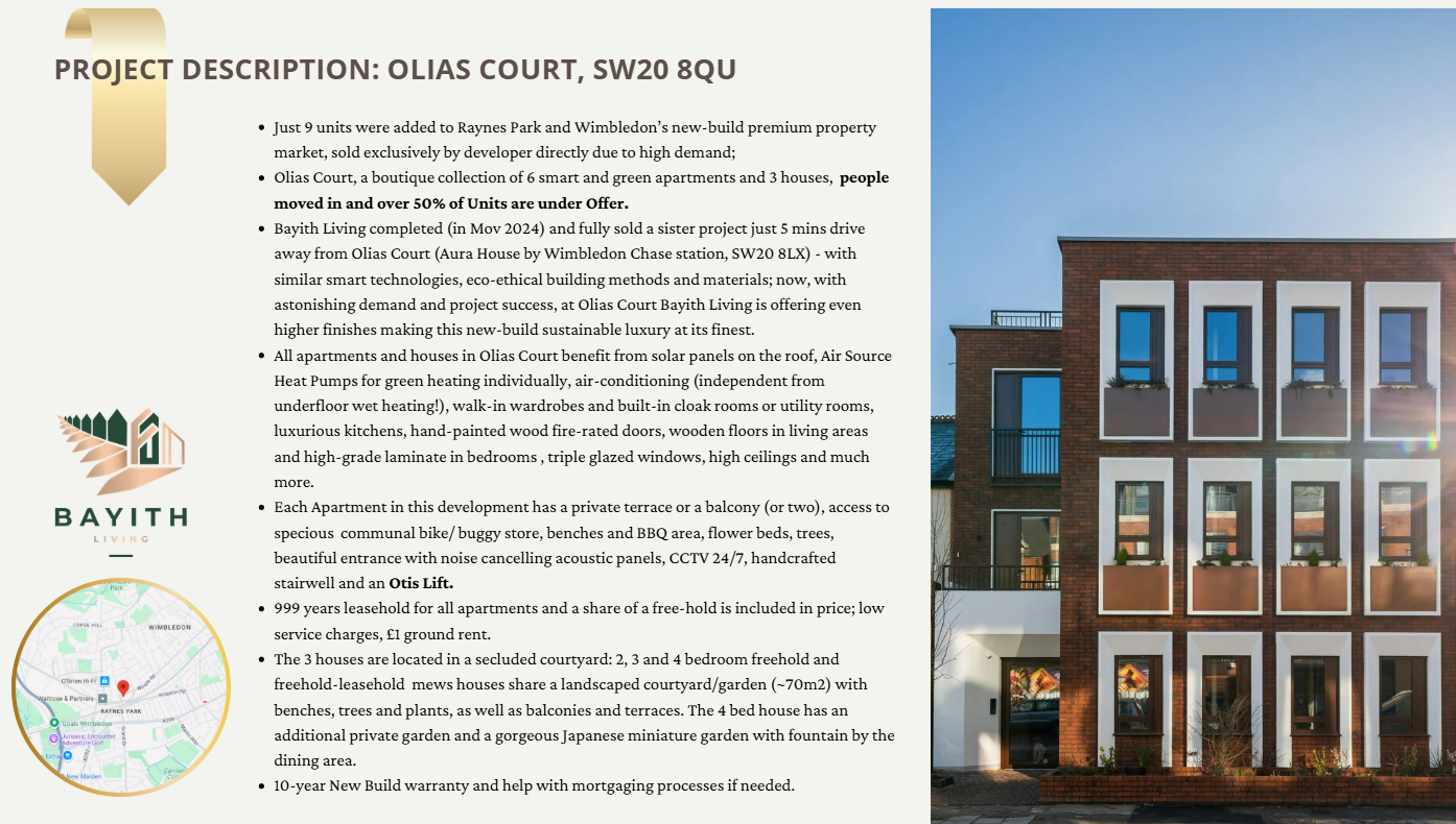 Just minutes from Raynes Park station, Olias Court is a captivating new-build development in West Wimbledon on a one-way part of Worple Road incorporating elegant traditional design and modern connected living: close to top schools, supermarkets, a medical centre, reformer Pilates studios, gyms ad more.