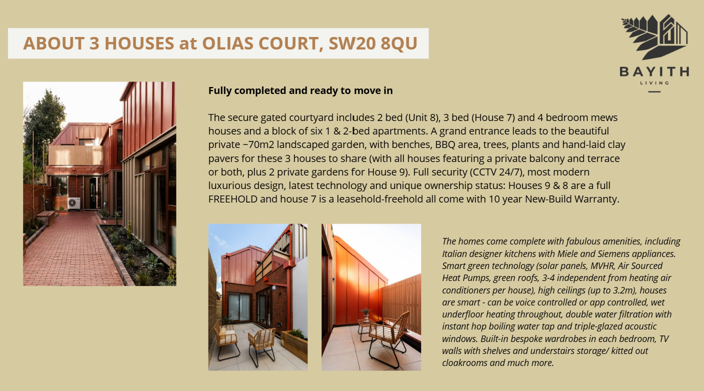 High-spec green apartments and houses, with bespoke walk-in wardrobes, air conditioning and green technology, high ceilings (up to 2.7m in apartments, and up to 3.2m in houses). Each Unit has a patio/ balcony or a terrace, additionally houses share a garden/ secure courtyard, private terraces. 4 bed house has 2 additional private gardens. All units have a specious shared bike store/ buggy storage, CCTV 24/7 and have full control over their freehold long-term (apartments and House 7 are sold as leasehold of 999 years and a share of freehold, included in price), houses 8 and 9 are fully FREEHOLD. Apartments benefit from an Otis lift